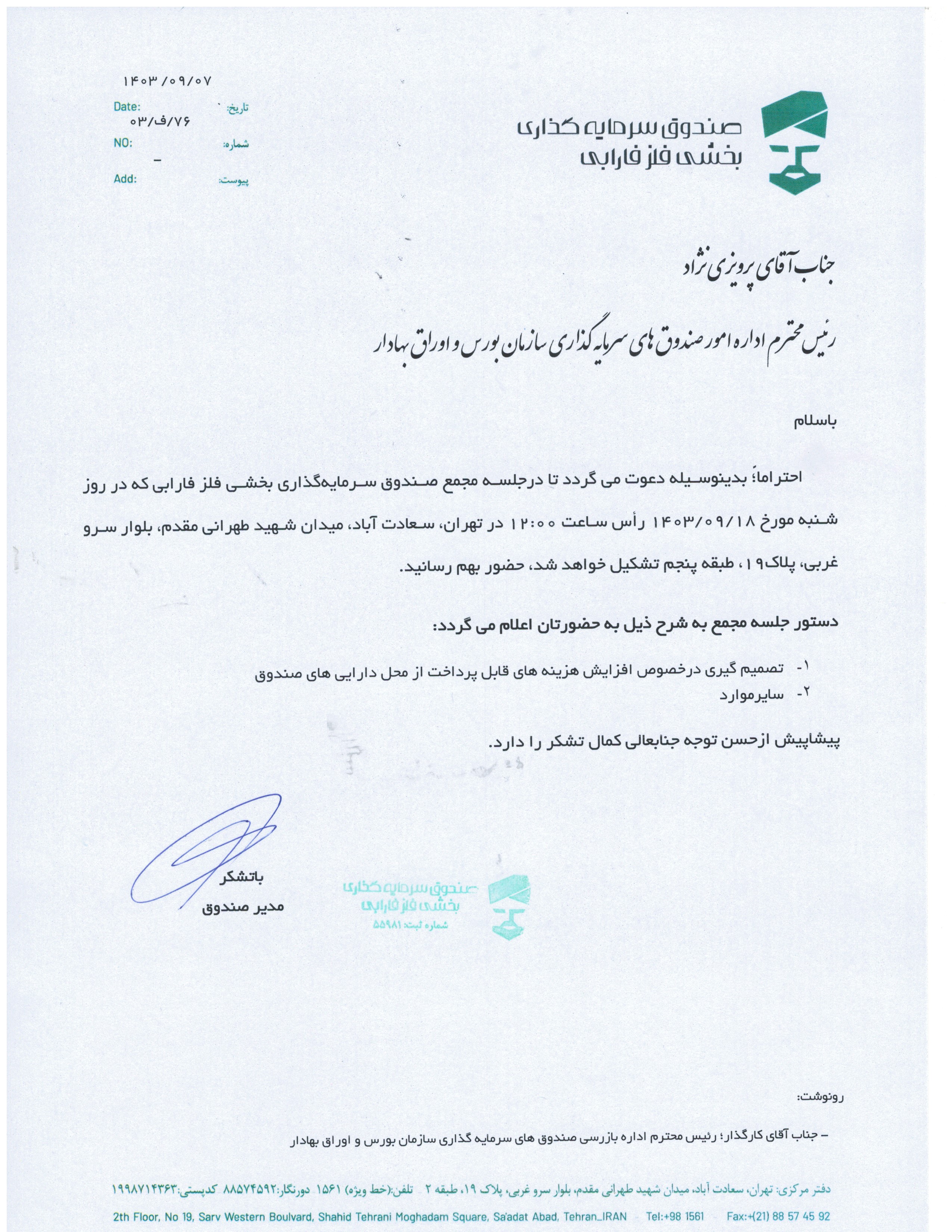 آگهي دعوت به مجمع مورخ 1403/09/18 ساعت 11:00 - مجمع ساليانه صندوق سرمايهگذاري بخشي فلز فارابي